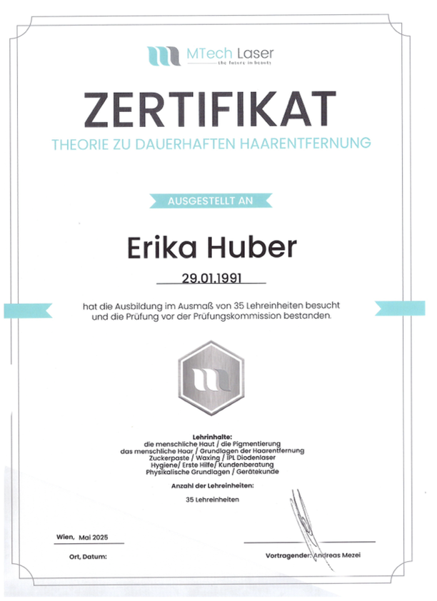 Ich heiße Erika Huber, bin im Waldviertel aufgewachsen und habe nach meiner Ausbildung zur Diplomierten Gesundheits- und Krankenpflegerin umfassend im Bereich der ästhetischen Medizin gearbeitet. Ich habe über 10 Jahre Berufserfahrung und zahlreiche Weiterbildungen im Bereich der Lasermedizin absolviert.